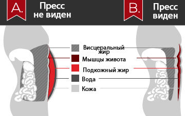 На рисунке В пресс виден, потому что в теле меньше процент жира, воды и гипертрофированы мышцы, на рис. А количество подкожного жира и воды больше