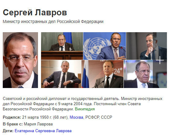 Сергей Викторович Лавров, глава Министерства Иностранных Дел РФ - легендарная личность в Российской Федерации! Он не просто министр иностранных дел, он тот министр иностранных дел, который планомерно и иногда жестко отстаивает интересы своей страны, Российской Федерации. Это вам не Козырев, министр иностранных дел при Ельцине, заявивший что у России: "У Российской Федерации - нет национальных интересов! Это настоящий русский мужик, который белое называет - белым, черное - черным, а иностранных журналистов: Видео - Youtube, канал - Provsio Novoe Говорят, что отец Лаврова - тбилисский армянин, по некоторым сведениям — по фамилии Калантарян. Но в этом нет ничего страшного. Сталин тоже был грузином, и генерал Багратион, и Берия... И я даже не считаю чем-то опасным и страшным в том, что его дочка учится(или уже училась?) в Соединеных Штатах Америки и даже, поговаривают, имеет гражданство США. По крайней мере Россия может ввести войска в США если гражданку РФ будут там обижать. Тем более д