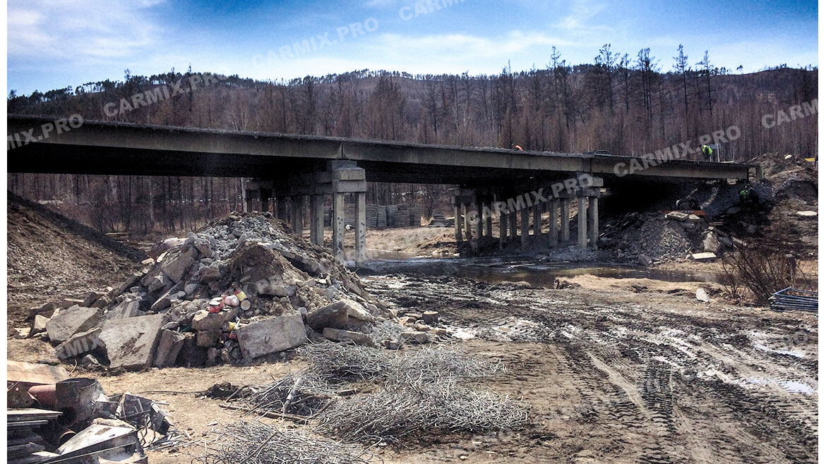 На трассе Чита-Хабаровск в 150 км от Читы предстоит полная реставрация моста — опоры и пролеты полностью разберут и заново зальют. Объем не очень большой — порядка 600 кубов бетона нужно залить за полгода. Работы проводятся поэтапно, чтобы полностью не перекрывать движение на мосту. Сначала будет заливаться одна опора, потом другая и так далее.
