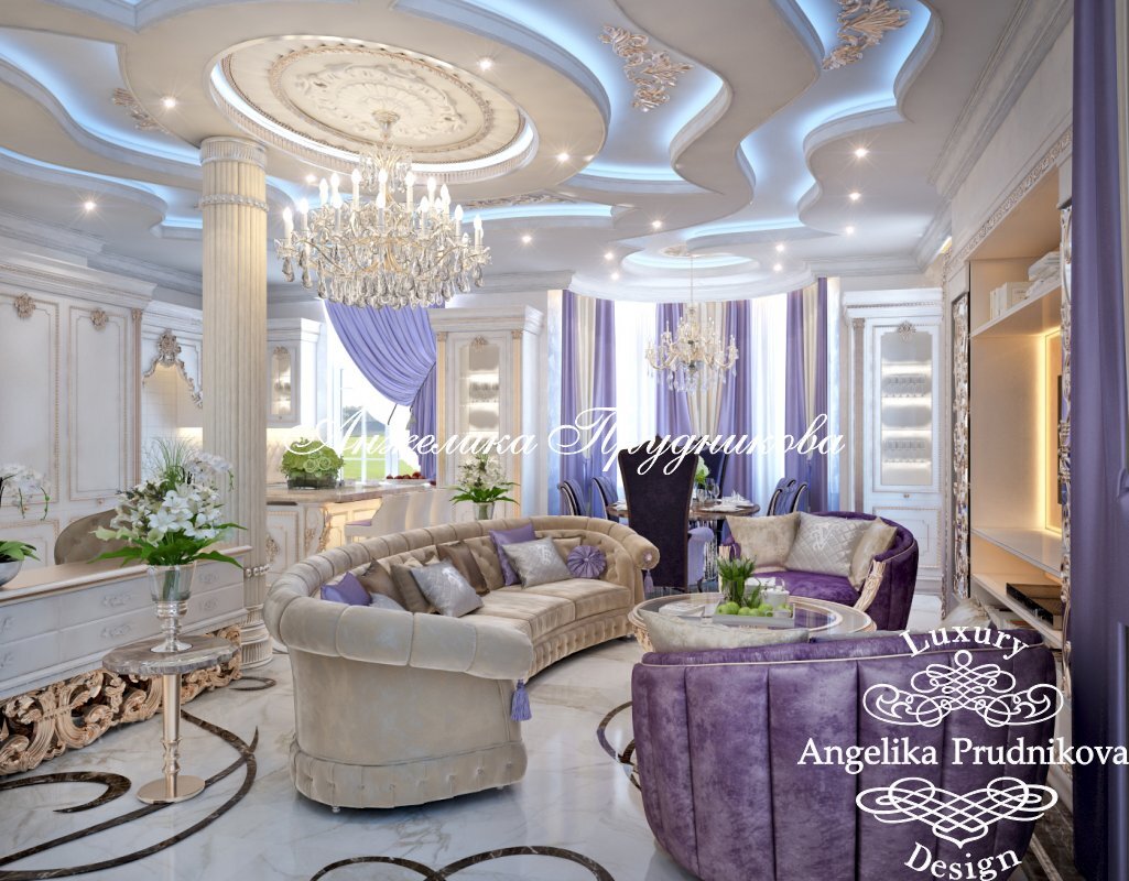 Дизайн интерьера коттеджа на фото – это квинтэссенция современной роскоши и уюта. В этом проекте руководитель Студии элитных интерьеров Анжелика Прудникова виртуозно соединила арт-деко и неоклассику, создав удивительно органичное и эффектное жилое пространство премиум-класса. Строгие лепные карнизы, круглые колонны с велюровой отделкой, хрустальные дворцовые люстры с имитацией свечей, серебристый и золотистый декор, обитые кремовым и сиреневым бархатом диваны и кресла – дизайн многофункциональной гостиной с эркером поражает изяществом и многообразием интересных декораторских решений. Праздничное настроение в помещении создает голубая светодиодная подсветка, акцентирующая внимание на изгибах сложного многоуровневого полотка. А струящиеся шторы из шелка и камин с классическим белым порталом делают гостиную уютной. Настоящей «жемчужиной» этого дизайн-проекта является декорированная зеркалами лестница с подсвеченными LED-лентой ступенями. Зеркальные панно визуально расширяют про