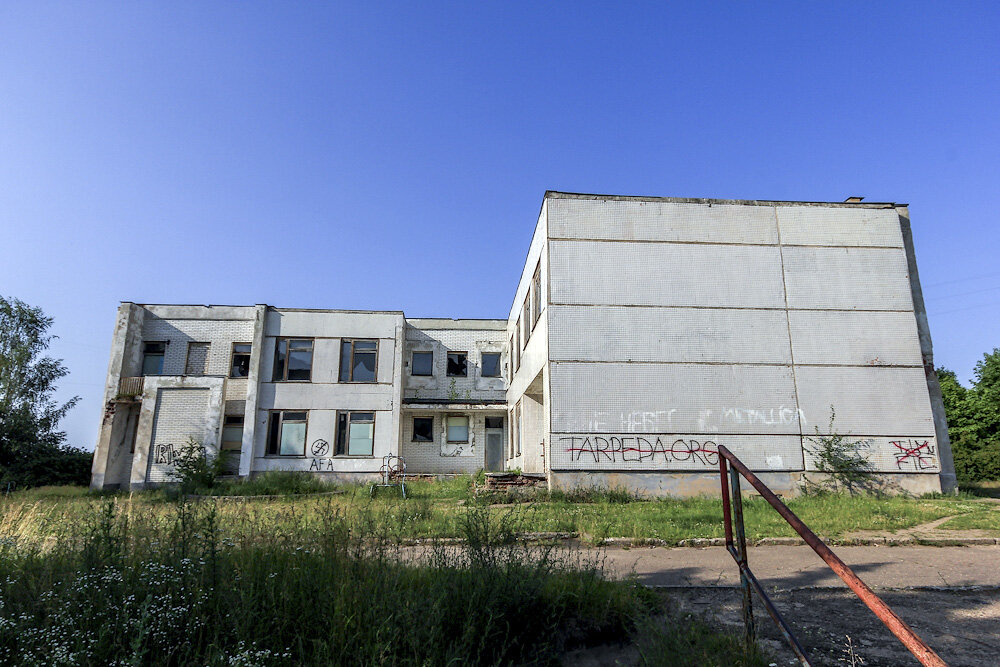 В жилом районе МАЗа целый ворох заброшек. Сначала дохожу до старого детского сада, все окна которого заложены кирпичом, на входе железная дверь без ручки. Может быть, внутри хранится золотой запас Беларуси, иначе зачем детский сад превратили в укреплённый замок?
