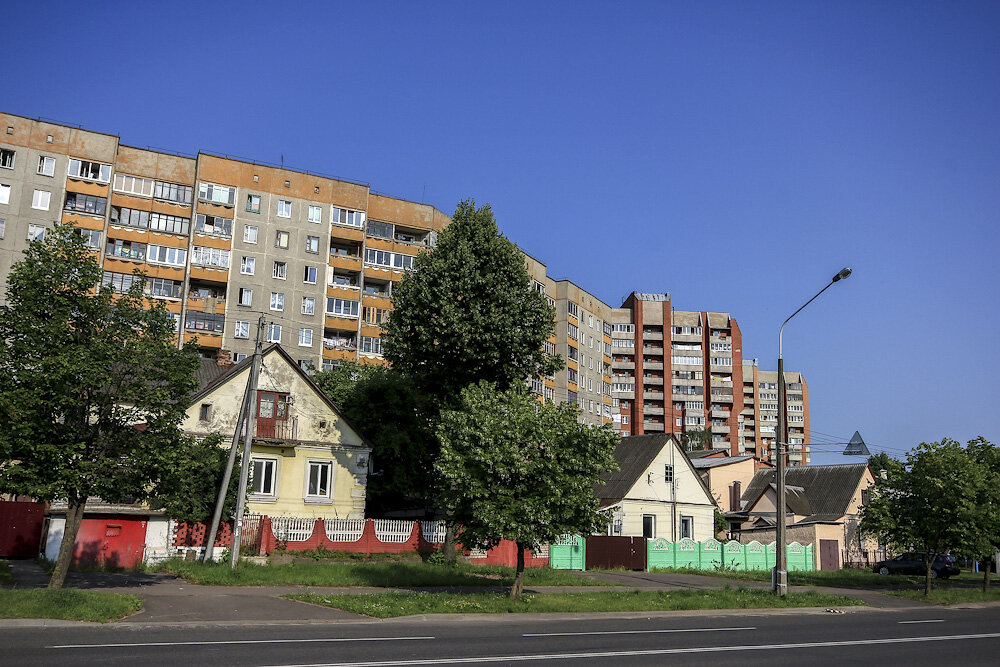 Прогулку я начал в живописном районе около конечной станции метро «Могилёвская». Пасторальная картина: на пригорке высятся многоэтажки, ниже сохранилась старая деревенская улица.