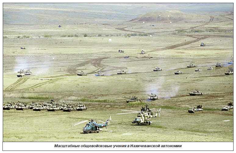 «Нахчыванская операция еще раз показала, что азербайджанская армия – сильная армия. Мы с большим профессионализмом можем выполнить и выполняем любую задачу. Отныне азербайджанская армия всегда должна быть готова к восстановлению территориальной целостности нашей страны», – заявил азербайджанский лидер, слова и дела которого прямо ведут к очередной военной эскалации вокруг Нагорного Карабаха, в случае которой нахичеванское направление может быть использовано для отвлекающих действий, в том числе диверсионно-террористического характера.