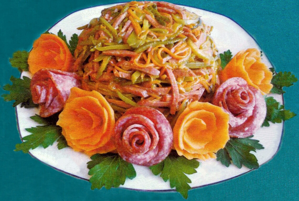 Ингредиенты: 200 гр. корейской моркови, 300 гр. сервелата, 1 луковица, 1 баночка маринованных огурчиков, 2 зубчика чеснока, растительное или оливковое масло, 1 упаковка кетчупа, молотый чёрный перец Для украшения: 2 моркови, 200 гр. сервелата, 1 пучок петрушки Способ приготовления: Маринованные огурчики достать из банки и нарезать тонкой соломкой. Северлат почистить от кожуры и порезать тоже соломкой. Зубчики чеснока почистить и измельчить. Луковицу очистить и порезать. На сковороду налить растительное или оливковое масло и обжарить лук до золотистого цвета. В салатнике смешать корейскую морковь, маринованные огурчики, сервелат, лук и чеснок, перемешать продукты. Для заправки салата в отдельной посуде соединить 1/3 стакана растительного или оливкового масла, 2 столовые ложки кетчупа, дополнить молотым чёрным перцем, перемешать. В салатник добавить заправку и сверху поставить гнёт, затем поставить салатник с гнётом в холодильник на всю ночь, чтобы салат пропитался. На следующий день до