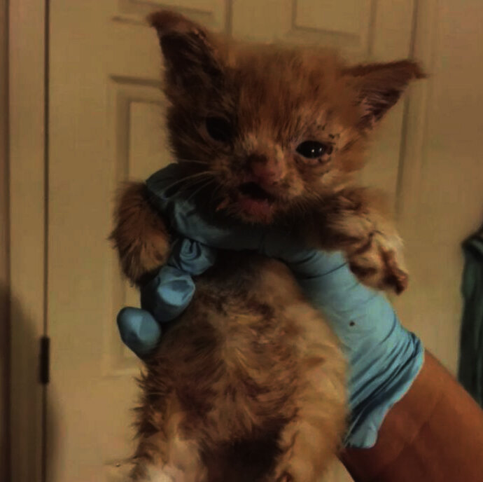 Мы гуляя около сельхоз академии увидели котенка сидящего на бордюре и отнесли его в вуз, где нам сказали, что он здоров