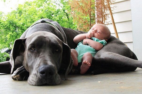 У нас собака, дог Герда. Сейчас ей уже 5 лет. А весит она почти 80 кг. Конечно, завести такую собаку в городской квартире было безумием. Ох, и намучились мы с ней, пока она была маленькой. Такие собаки взрослеют очень долго. Почти год мы убирали за ней внушительные кучи и вытирали лужи. Пока росла, съедала чуть ли не по ведру каша в день. Но Герда такая добрая, игривая, что мы, невзирая на все трудности, очень любим ее. Теперь наша собака уже серьезная и умная, как человек. Девять месяцев назад у нас родился сынок, Матвей. Этот шалунишка начал ползать и шкодить везде. За ним нужен глаз, да глаз. Герда и раньше нам неплохо помогала. Охраняла коляску, когда мне нужно было зайти в магазин. Несла домой сумки с продуктами. А теперь вообще стала незаменимой нянькой. Как и все малыши, Матвей любит пошарить в ящиках. Только откроет какой-нибудь ящик, Герда подойдет, лапой устранит непорядок, сядет у шкафа, прижмется спиной. Матвей понимает, что спорить с собакой бесполезно. Ползет заниматься
