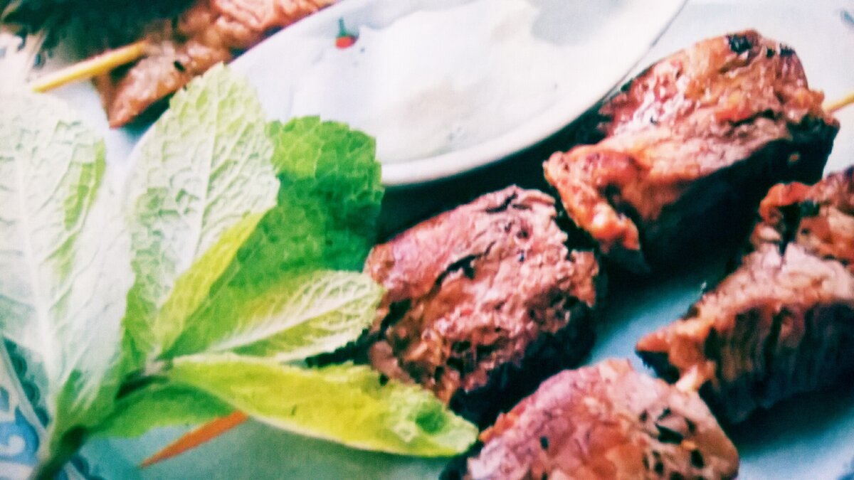 Нам понадобится: *говядина-500г *масло растительное-1стакан *сушёный орегано-1ст.л. *размарин-1ст.л. *эстрагон-1ст.л. *лимонный сок,соль,перец-по вкусу Для соуса нам понадобится: *сметана-1стакан *нарубленная мята-0,5стакана *мёд-1ст.л. *лимонный сок,соль,перец-по вкусу Итак начнём готовить Мясо нарезать кусочками. Остальные компоненты смешайте,выложите в маринад говядину и оставте на полчаса.Нанижите мясо на шпажки,поджарьте на обычной сковороде или сковороде-гриль 15-25 минут.Смешайте ингредиенты для соуса,и подавайте с ним кебаб Приятного аппетита. Понравился рецепт,ставь палец в верх и подписывался на мой канал.