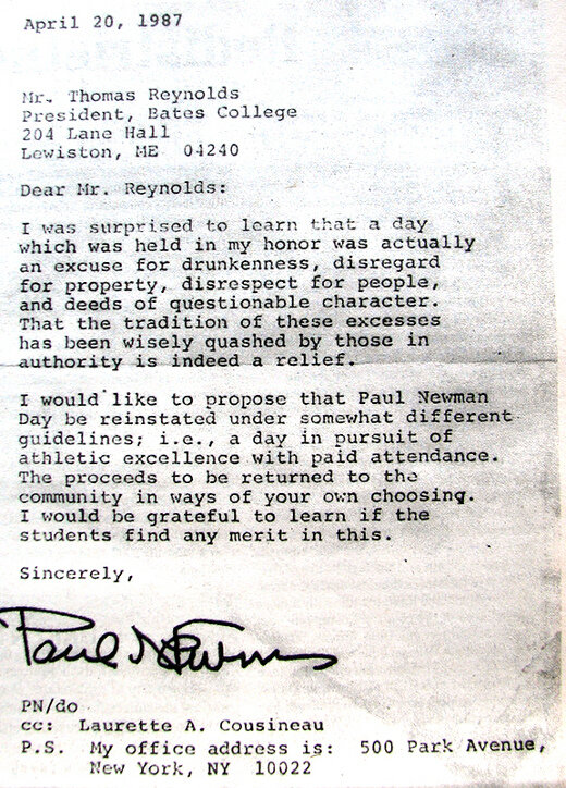 26 января, в пятницу, студенты американского колледжа "Бэйтс" приняли участие в "пьяном" ритуале: каждый участник за 24 часа должен был выпить 24 бутылки пива, при этом занимаясь повседневными делами. Известная как "день Ньюмана", эта традиция была посвящена актеру Полу Ньюману, который сказал эти строки в кампусе: "24 пива, 24 часа в сутки. Совпадение? Я так не думаю" День Ньюмана в 1987 году завершился очень буйно, следствием этого стало пресечение мистической традиции. Недолго думая, актер послал письмо президенту университета. Перевод Апрель, 20, 1987 Мистеру Томасу Рейнольдсу