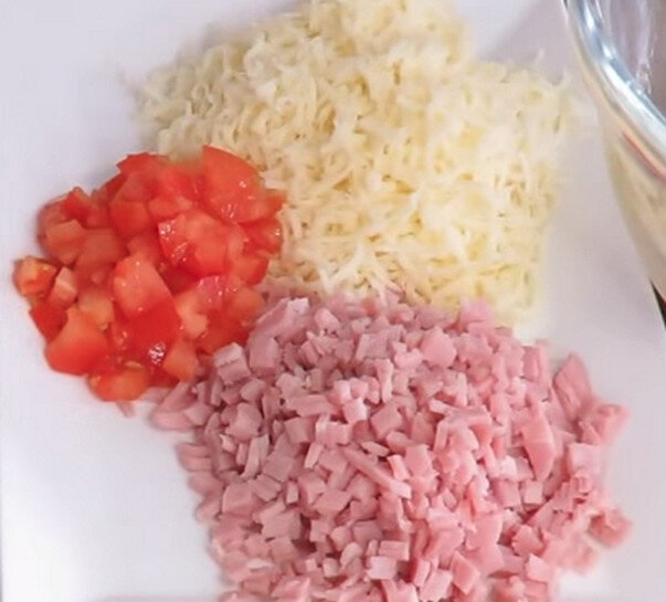 3. Мелко нарезаем ветчину или колбасу. На мелкой тёрке натираем сыр. Половинку помидора тоже режим мелким кубиком.