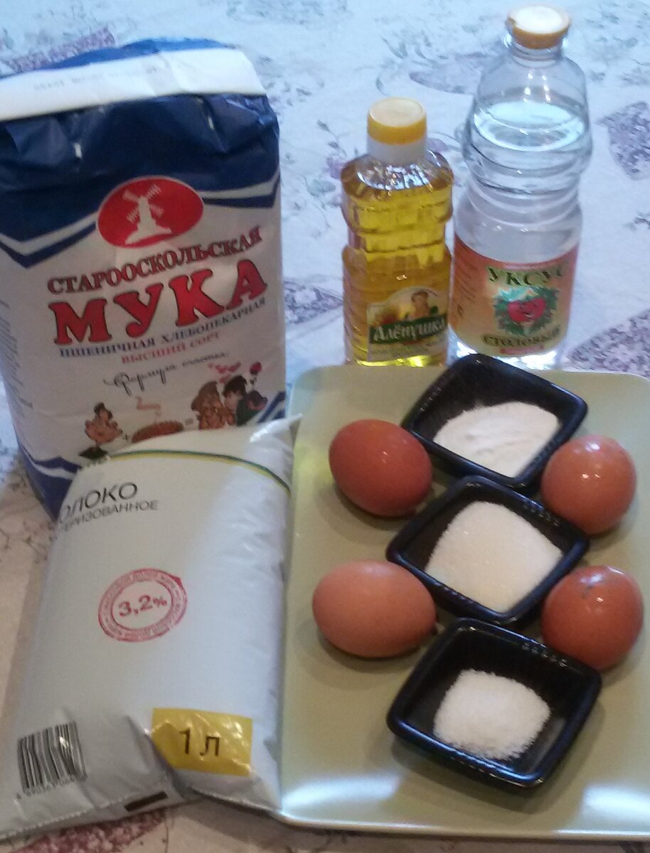 - 1 литр молока - 400 грамм муки - 4 яйца - 2 столовые ложки сахара - 1 чайная ложка соли - 4 столовые ложки растительного масла - 1 столовая ложка соды - 2 столовые ложки уксуса - 70 грамм сливочного масла (для «секретика») 1. В большой миске взбиваем венчиком яйца, сахар и соль. (!) Можно воспользоваться миксером, но я предпочитаю старый, добрый венчик...)) 2. Добавляем растительное масло и всё тщательно перемешиваем. 3. Вливаем молоко и опять тщательно взбиваем. (!) Молоко лучше заранее достать из холодильника,