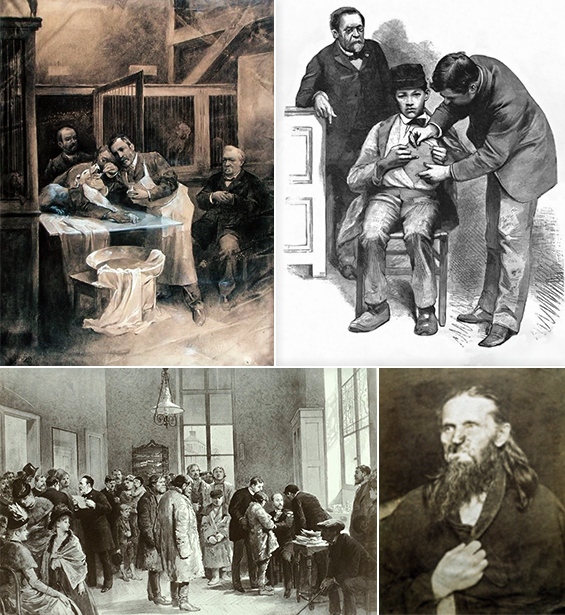 Вверху справа: октябрь 1885-го, в кабинете Пастера вакцинируют от бешенства пастуха Жан-Батиста Жюпиля (1869-1923). Рисунок на обложке журнала "Ля Репюблик Иллюстре" от 3.IV.1886.