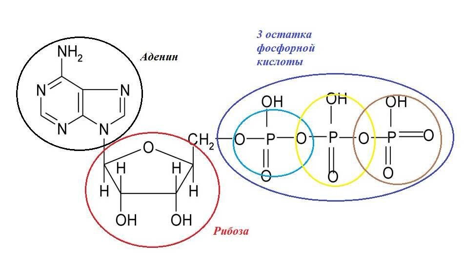 Универсальным источником энергии для мышц и всего организма является соединение А.Т.Ф. (аденозинтрифосфат). АТФ по химическому строению является нуклеозидом,макроэргом(несёт в себе потенциальную энергию), состоит из трех соединений: аденин(азотистое основание), рибоза(углевод), фосфорная кислота. В качестве источников АТФ организм использует жиры,белки,углеводы. Т.е. то, что мы употребляем в пищу. Если сказать проще, то организм при помощи разных метаболических путей преобразует б/ж/у в энергию. На рисунке ниже нарисовано химическое строение и показаны каждый из элементов.