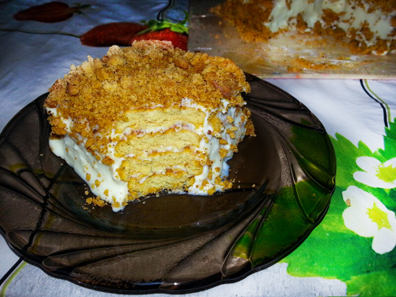 · сгущенное молоко – 1\2 банки; Обратите внимание! Если в наличии нет сгущенного молока, крем делаем из сметаны (20%) и сахара (около стакана). Пошаговый рецепт торта без выпечки с печеньем Способ приготовления: 1. Смешиваем творог со сгущенным молоком. 2. Взбиваем: для ускорения процесса используем блендер. Но если его нет, подойдет и ручной миксер. 3. Количество печенья выкладываем столько, сколько порций требуется. В нашем случае – 6. 4. Выкладываем печенье слоями, промазывая каждый слой кремом. При этом первый слой печенья промазываем с обеих сторон. 5. Завершив промазывание, посыпаем торт крошкой из печенья. 6. Вот такой