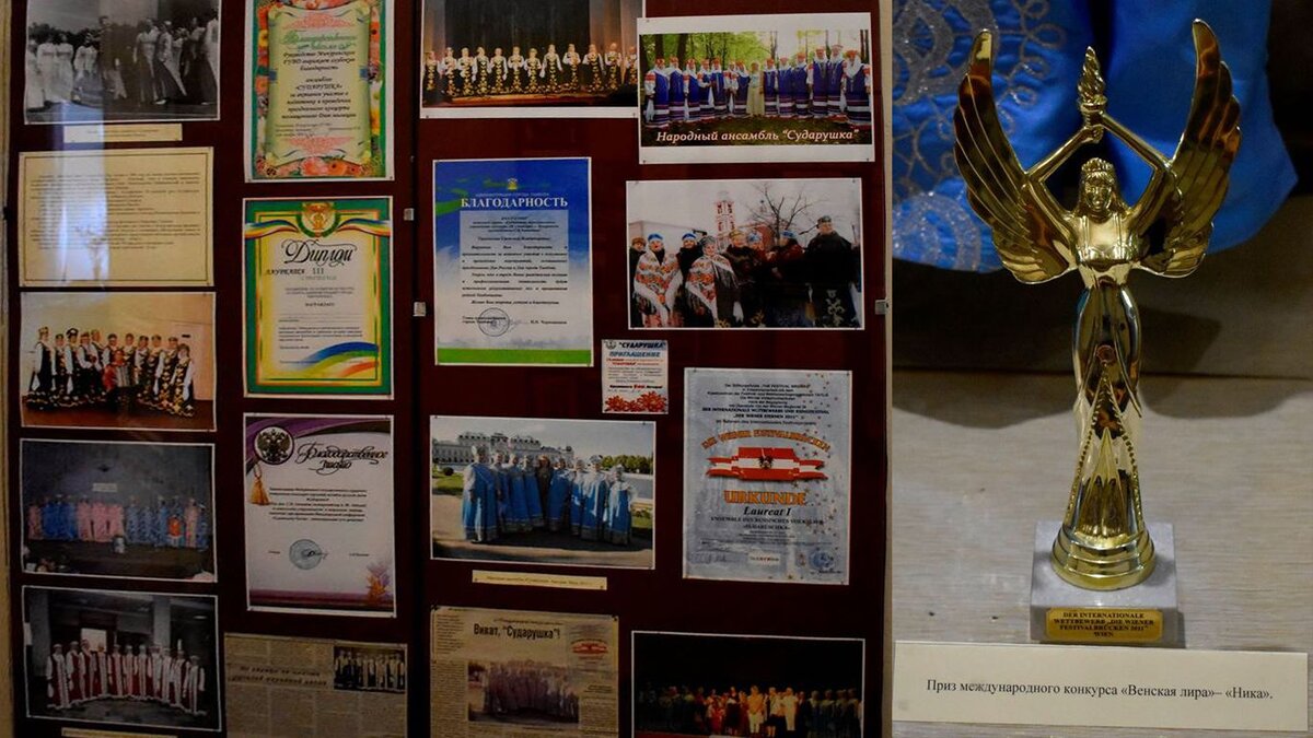 Мичуринский краеведческий музей продолжает знакомить посетителей музея с историей и культурой города. Очередная выставка тому подтверждение. Материалы новой выставки рассказывают об истории создания ансамбля народной песни «Сударушка». В экспозиции представлены фотографии, дипломы, почётные грамоты коллектива, концертный костюм и уникальный экспонат – позолоченная статуэтка «Ника», которая была вручена в 2011 году «Сударушке», ставшей победительницей в международном конкурсе - фестивале «Венская весна» в номинации «Фольклорное пение» в возрастной категории от 50 до 70 лет.