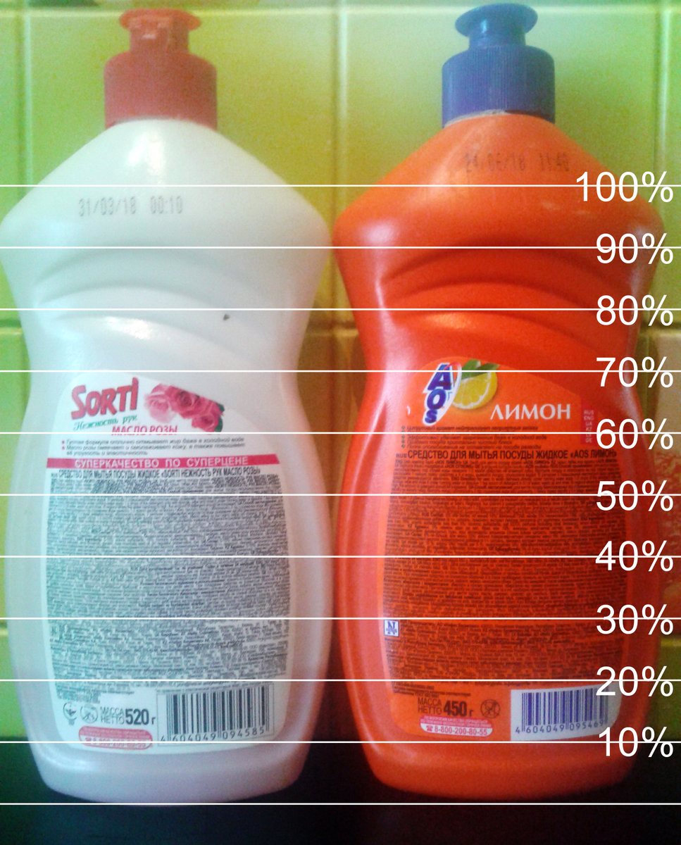 Вашему вниманию предлагается занимательная головоломка, любезно предоставленная нашими производителями. Не стал затирать торговые марки, всё равно по внешнему оформлению вы их угадаете. Исходные данные: две одинаковые ёмкости, явно произведенные каким-то одним заводом полимерных изделий, в них налиты жидкости для мытья посуды от разных производителей. Не думаю, что удельный вес этих жидкостей кардинально отличается друг от друга (хотя может в одну из них добавлен свинец для веса?) Но факт налицо (или лукавство?) - в одной емкости 520 гр., в другой - всего 450гр. У обоих марок указаны граммы! Специально поставил линии, отстоящих друг от друга на равном расстоянии и обозначающие проценты. Если допустить, что до риски 100% налито 520 гр. в белой ёмкости, то получается что в оранжевой ёмкости меньше на 15,55%. теперь смотрим на оранжевую и прикидываем до какого уровня налит объём 84,45%. Что-то маловато, не правда ли? Вряд ли такое может быть, при открытии нового флакона нам бы пришлось е