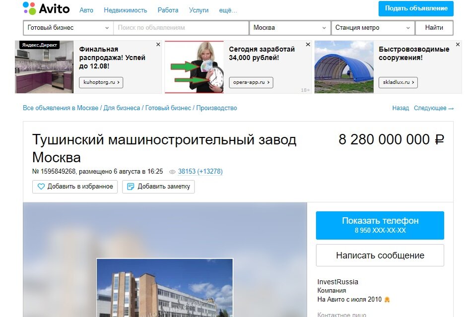 Крупнейшее авиакосмическое предприятие России выставлено на Avito. Нет, это не прикол - теперь на онлайн-барахолке можно купить не только старый гаджет или коврик для занятия спортом, но и корпуса обанкротившегося ОАО «Тушинский машиностроительный завод». Цена вопроса - 8,2 миллиарда (оказывается, это уже вторая попытка, сначала просили на 2 ляма больше). Тушмаш спускал с конвейера фронтовые истребители Як-7, Як-9, также и гражданскую продукцию — троллейбусы, трамваи, автобусы, и оборудование для гидроэлектростанций, а главное - именно он производил легендарный космолет "Буран"! «Саратовский банк выдал кредит, а завод не смог справиться, и в итоге он перешел к банку. Банку неинтересно держать у себя неактивный завод, соответственно, он его выставляет на торги по банкротству <...> Avito — один из способов продажи наших объектов, у нас и другие электронные площадки. Никто не запрещает выкладывать это и на Avito в том числе», — рассказал журналистам представитель компании InvestRussia.
