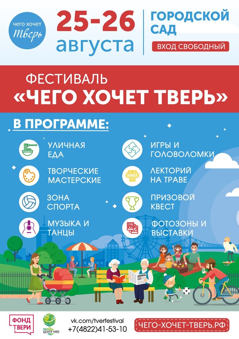 25 и 26 августа на территории Городского сада пройдет ежегодный городской фестиваль «Чего хочет Тверь». Для участников праздника будут подготовлены различные площадки. Все желающие смогут попробовать свои силы в квесте «Играем в город», принять участие в тренингах и лекциях на площадке «Территория развития». Для любителей активного отдыха будет работать «Зона спорта», где пройдут соревнования по езде на самокатах и беговелах. Кроме того, гостей праздника ждут розыгрыши призов, тематические фотозоны, настольные игры, музыкальные выступления. Также вечером 25 августа можно будет посмотреть короткометражки в рамках Всероссийского фестиваля уличного кино или потанцевать под музыкальные сеты. Время работы фестиваля: 25 августа с 12.00 до 00.00, 26 августа с 12.00 до 19.00. Газета «Караван+Я» выходит на территории Тверской и Московской областей с приложением «Ярмарка объявлений». Работа, недвижимость, строительство, образование, туризм, бизнес – все, что вам необходимо знать, вы найдете у