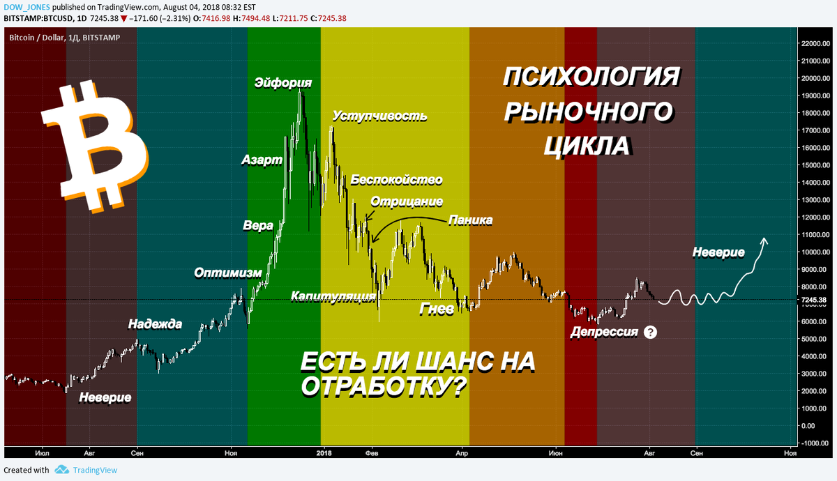 На данный момент, судя по всему, мы находимся в стадии "Депрессии". Относительно недавно был пробит очередной low и намеков на восстановление рынка так и не было. Сейчас мы видим некий подъем, но настроения ведь у всех до сих пор депрессивные, не так ли?