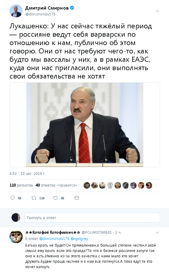 Во время посещения ОАО "Гомсельмаш" Президент Беларуси Александр Лукашенко поручил запустить в стране масштабную программу по восстановлению и модернизации отслужившей свой срок техники и высказался относительно отношщений между Россией и РБ. Как выяснилось из его слов, он оказался недоволен действиями России в рамках евразийского экономического союза (ЕАЭС), а положение республики Беларусь он считает вассальным. Он обвинил Россию «недобросовестной конкуренции» с партнерами по ЕАЭС, упрекнул в том, что Россия ведет себя по-варварски и не выполняет своих обязательств, взятых в рамках союза. "Я хочу сохранить „Гомсельмаш“. У нас сейчас тяжелый период — россияне ведут себя варварски по отношению к нам, публично об этом говорю. Они от нас требуют чего-то, как будто мы вассалы у них, а в рамках ЕАЭС, куда они нас пригласили, они выполнять свои обязательства не хотят. Вот они и создают неконкурентную ситуацию", - сказал Лукашенко при общении с работниками ОАО "Гомсельмаш", слова которого п