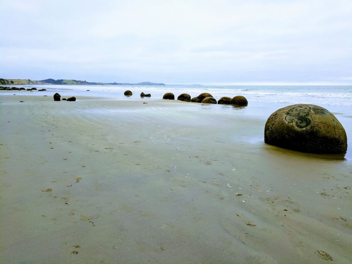 Вы не поверите, сколько в Новой Зеландии так называемых «новых чудес света». Сегодня мы прикоснёмся к творениям, созданным более 60 миллионов лет назад (так что про «новизну» в этом случае можно и поспорить). Итак, "Валуны Моераки»: Маори (куда же без них) считают, что это всё – стаф с некого каноэ «Арай-те-уру» при крушении упало лута на всех, но, пока эти все до него дошли, оно заэкспайрилось. Но пока что (!) они доказать в суде это не могут, поэтому доступ открыт для всех, готовых проехать 300+300 километров без какой-либо связи, но с кучей китайцев за пределами борта машины. Немного про скучное: находятся эти валуны на побережье Отаго, недалече от Коехохе. А сам «Моераки» — бывший рыбацкий городок, теперь надолго поставленный на иглу туризма. Им бы облагородить участок, да гонять вандалов, но зачем? Турики валят автобусами, бусы на огненную воду меняют, что ещё? Но понятно же, почему версия маорийцев верна! Все названия их! Значит, и место должно быть их! Но суд что-то сопротивляет