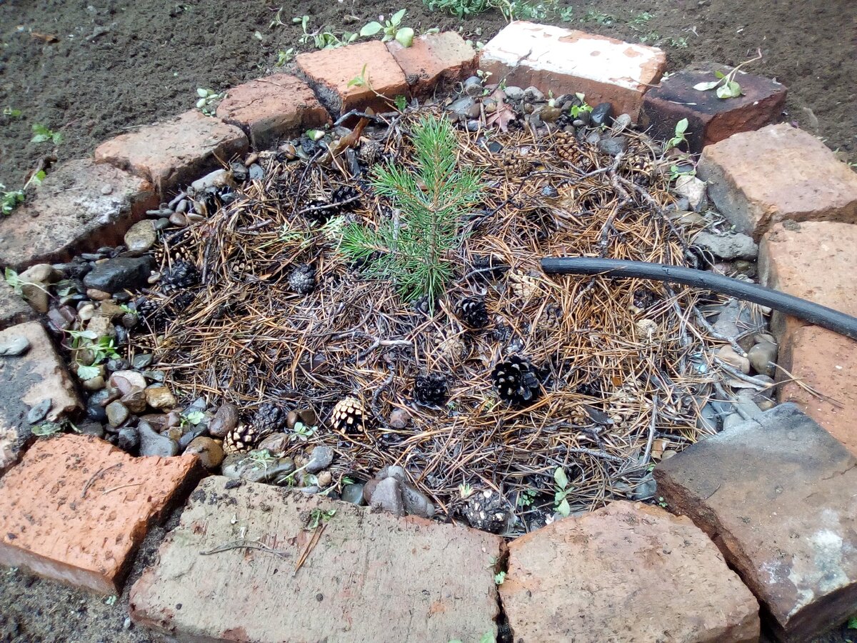 Ровно два месяца назад я решил пересадить сосну из хвойного леса на частный участок. Такие мысли приходили ко мне не один год, но всё время находились причины перенести посадку, самая популярная из них - это лень. Для пересадки я взял небольшую сосенку, высотой не более 30 сантиметров. Окопал по периметру, выкопал вместе с комом, не повредив корни. На участке у меня имеется не большая полянка, где хранился разный строительный мусор (или полезные вещи)). Её я предварительно расчистил, выкопал ямку 50х50см, заложил дренаж из морской гальки. Удобрений как таковых я не использовал, почва у меня на участке песчаная, разве что расчистил от мусора и хорошо прорыхлил. Обложил место посадки кирпичами, по краям накидал мелкой гальки, что бы вода не "уходила" из посадочного места и не заливала всё подряд. Так же на место посадки, буквально вчера решил выложить немного хвороста, шишек и сосновых иголок из ближайшего леса, покрошил туда пару рыжиков :) Сосновые иголки отлично изолируют почву от из