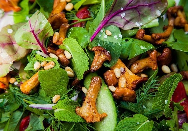 время приготовления:30 минут.на 4 порции продукты:250г лисичек 250 г помидоров черри 0.5 красной луковицы 1 зубчик чеснока. 2 побега зеленого .1 ст.ложка лимонного сока, 0.5 ч.л. тертой лимонной цедры.1 ст.л.кедровых орешков.3 ст.л.оливкового масла.10 г пармезана.соль,перец. Приготовление 1.Грибы вымыть.Обжарить помешивая,в 1ст.л,растительного масла 10-12 мин,до готовности.В конце добавить мелко порубленный чеснок,влить лимонный сок и приправить солью,перцем и цедрой.Остудить. 2.Помидоры вымыть и разрезать на четыре части.Репчатый лук тонко нашинковать. Зеленый лук нарезать кусочками по 3-4 см. 3.Перемешать все ингредиенты,заправить салат маслом,посолить поперчить по вкусу, переложить в салатник,посыпать кедровыми орешками и тонко наструганным пармезаном.
