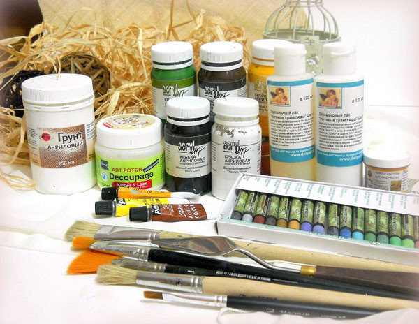 Вдумавшись в описанный выше процесс декупажа, можно легко разобраться, что необходимо иметь любому человеку, который интересуется декупажем. Но не все из этого нужно новичку, желающему оценить данный вид творчества и попробовать себя в нем. Да и затраты на декупаж в случае покупки сразу всего могут неприятно удивить. Не стоит бросаться в первый попавшийся магазин и скучать все, что может вам вообще не пригодится, или пригодится нескоро. У всех материалов есть срок годности. Конечно, специальные материалы и инструменты лучше чем подручные заменители. Но будьте готовы к тому, что делая первые работы, вам, скорее всего, придётся по несколько раз смывать, чтобы получить желаемый результат. И уж конечно мысль о том, что вы смываете в канализацию дорогущие материалы, не должна мешать этому захватывающему процессу. Кроме того, надо знать, что покупать и для чего, какой минимум знаний и навыков надо иметь, используя тот или иной материал. По каким-то неизвестным нам причинам, практически все начинающие декупажницы уже в первых своих работах стараются сделать кракелюр. А потом бывают неприятно удивлены, когда видят, что кракелюр не получился или получился совсем не такой, как им хотелось из-за того, что под него была плохо подготовлена поверхность.