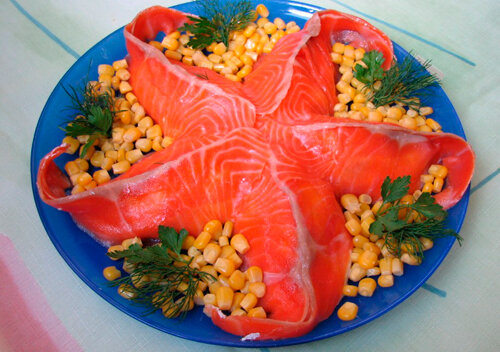 Приготовление: Это слоеный салат, каждый слой нужно намазать майонезом и слегка посолить. В детской версии салата используем сметану, тогда количество соли нужно увеличить. Первым дело отвариваем 300 грамм картофеля и 2 яйца. Когда они приготовятся, остужаем, чистим и трем на крупной терке. Берем пачку крабовых палочек и режем мелкими кусками. Одну-две палочки нужно оставить на украшение. На большое плоское блюдо выкладываем картофель в форме звезды. Поверх идет нарезанный огурец. Потом кладем крабовые палочки. Следующий слой – яйца. Сверху накладываем порезанную красную рыбу. Нужно взять 200 грамм форели или семги. По контуру выкладываем кружочки маслин и листочки салата. Делаем нос и рот звезды из кусочков белка и маслин. Красочный салат готов. Пальчики оближешь!