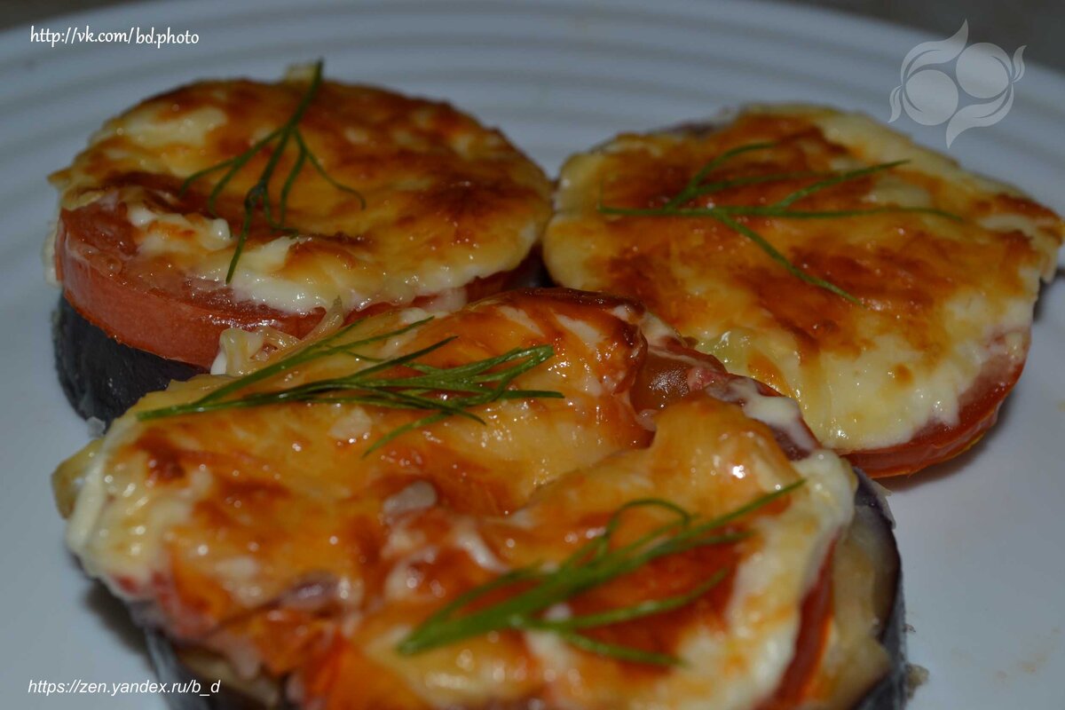 * Сверху на баклажан положить пластики помидора. Помидор смазать чесночным майонезом. * На мелкой терке натереть сыр и распределить на каждый кружочек нашей закуски. * Противень поставить в заранее разогретую духовку до готовности. Примерно на 20 минут. Смотрим по состоянию сырной корочки. Вот и готово! Можно