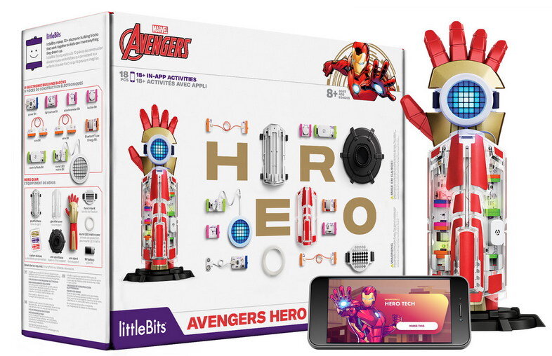 LittleBits в команде с Marvel Entertainment готовится к запуску Avengers Hero Inventor Kit в 2018 году. Дети смогут собрать перчатку Железного человека, добавив на неё выбранные носимые технические датчики, кодируя блоки в приложении, настраивая дизайн светодиодной матрицы и добавляя аутентичные звуковые эффекты Marvel Avengers. Изобретай свои сверхспособности самостоятельно! Новый набор позволяет детям создавать и подгонять под себя высокотехнологичные модели, включая собственную перчатку Железного человека. Используя технологию littleBits и электронные блоки, всё это получается не так уж сложно. Marvel Мстители, включая Железного человека, Халка, Чёрную вдову, Чёрную пантеру и других героев, будут направлять юных изобретателей через "геройское обучение" в приложении Avengers Hero Inventor app. Дети будут выполнять разные действия, настраивая свет, скорость, невидимость, звук, кодируя некоторые моменты своей перчатки. "Для нас важно предоставить детям разнообразный опы