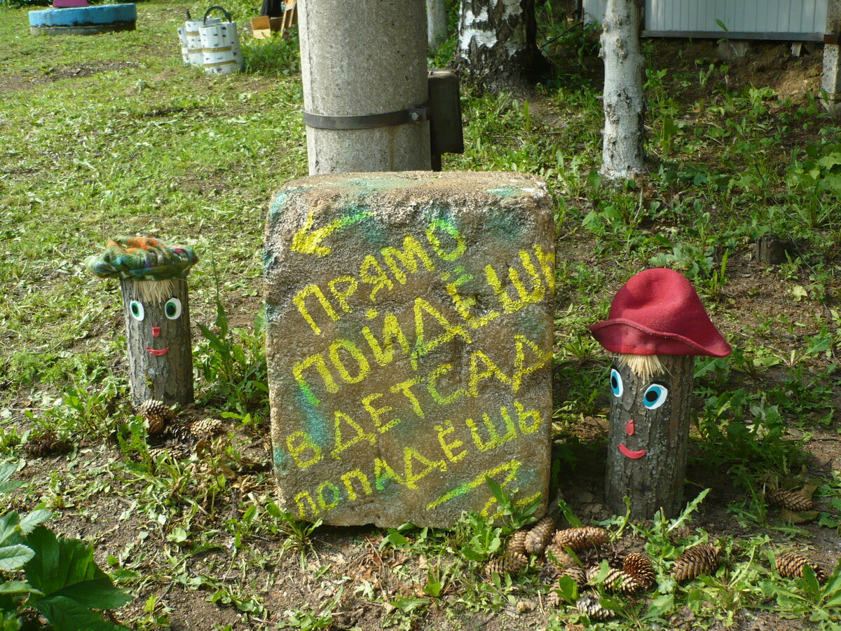 Все наши идеи по оформлению территории отличались тем, что не требовали никаких материальных вложений, поэтому воплощались практически мгновенно на базе всякого бросового материала. Этот таинственный сказочный камень при входе-обычный кусок старого пенопласта. И первый вариант охранников при камне был слегка слабеньким, откровенно говоря)))