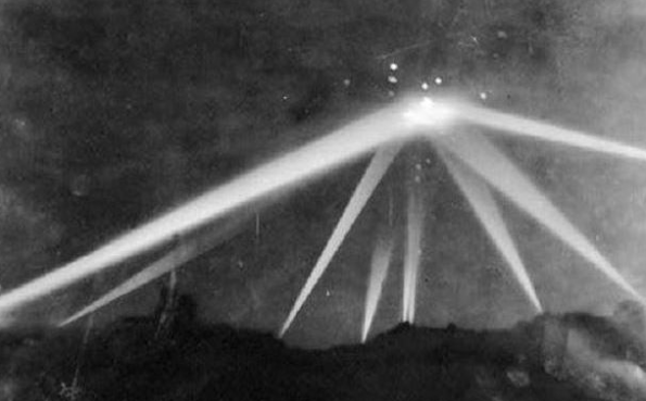 На видео изображены прожекторы, в то время как 12,8-фунтовые зенитные пули стреляют в сторону светящегося корабля.