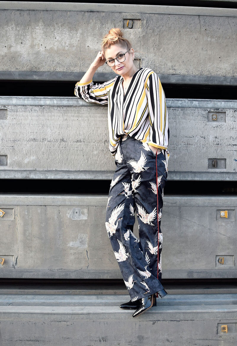 Сочетание нескольких рисунков в одном образе еще несколько лет назад казалось невозможным, считалось, что они перегружают образ. Однако теперь мы знаем точно, что умелое сочетание принтов а) актуально, b) создает сильный и жизнерадостный образ. Можем ли мы совершенно произвольно соединять в одном аутфите любые цветные вещи из нашего гардероба? Ответ - нет. Чтобы весь образ выглядел гармонично, необходимо придерживаться следующих простых советов: 1. Комбинируем принты одной цветовой гаммы Полосатая блуза с запахом и брюки с крупными райскими птицами образуют очень гармоничное сочетание, так как доминирующие цвета этих вещей совпадают. В каждой вещи присутствуют желтый, серый, черный и розовый, благодаря чему весь образ становится уравновешенным и спокойным. 2. Миксуем принты на фоне лаконичного кроя Если в образе ставится акцент на сочетание принтов, то крой одежды должен быть лаконичным, как бы образуя полотно для кисти художника. Лучше всего подходит непринужденная одежда классиче