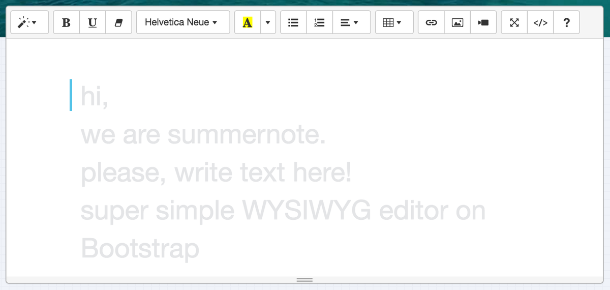 Называется сие чудо summernote. Реально простой, удобный, есть все что нужно. Нужно сделать страницу чтобы девочки сами могли создавать контент, таблички там, заголовки, картинки добавляли и т.п. Работал с CKEditor до этого и еще с одним TinyMCE кажется. CKEditor использовал у себя на сайте, но там мне надо было дополнительно еще и код вставлять, подключил для этого Highlight библиотеку, но побороть я его не мог, оставил до лучший времен, а тут надо было подыскать что нибудь, чтобы не опытные девочки сами с контентом работали и вот таким образом я его в общем нашел! В первую очередь фотографии!!!! О, это целая головная боль, в CKEditor по моему нужно было подкупать дополнительный функционал. Как то влиять на него у меня не получалось, поэтому делал формы для загрузки изображений снаружи от редактора, и потом туда надо было вставлять вручную копируя ссылку, сами понимаете это зло какое то. В этом редакторе просто шикарно реализовано, не хотите заморачиваться, пожалуйста, картинка встав