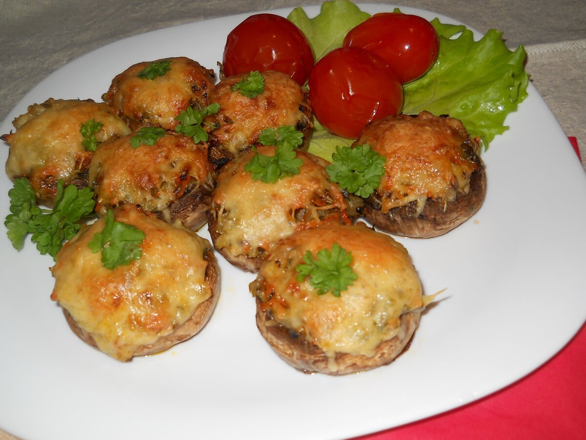 продукты на 4 порции:4 шляпки крупных шампиньонов.4 небольших куриных филе 2 ст.л.оливкового масла.2ст.л.сливочного масла соль. молотый черный перец.0.5 лимона.2ст.л измельченной петрушки 1 зубчик чеснока Приготовление 1.Стереть цедру с половины лимона.Измельчить чеснок.В сотейнике разогреть оливковое масло,добавить сливочное,положить лимонную цедру,чеснок и рубленную зелень петрушки. 2.Окунуть в полученную смесь шляпки грибов,уложить их на противень,посолить,поперчить.Филе нарезать кусочками,посолить,поперчить и разложить по шляпкам.Сбрызнуть маслом и поставить в разогретую до 230 градусов духовку. 3.Через 15 мин. разложить в гнезда оставшуюся смесь масел с ченоком,цедрой и зеленью.Поместить еще на 5 мин. в духовку.Подавать горячими.