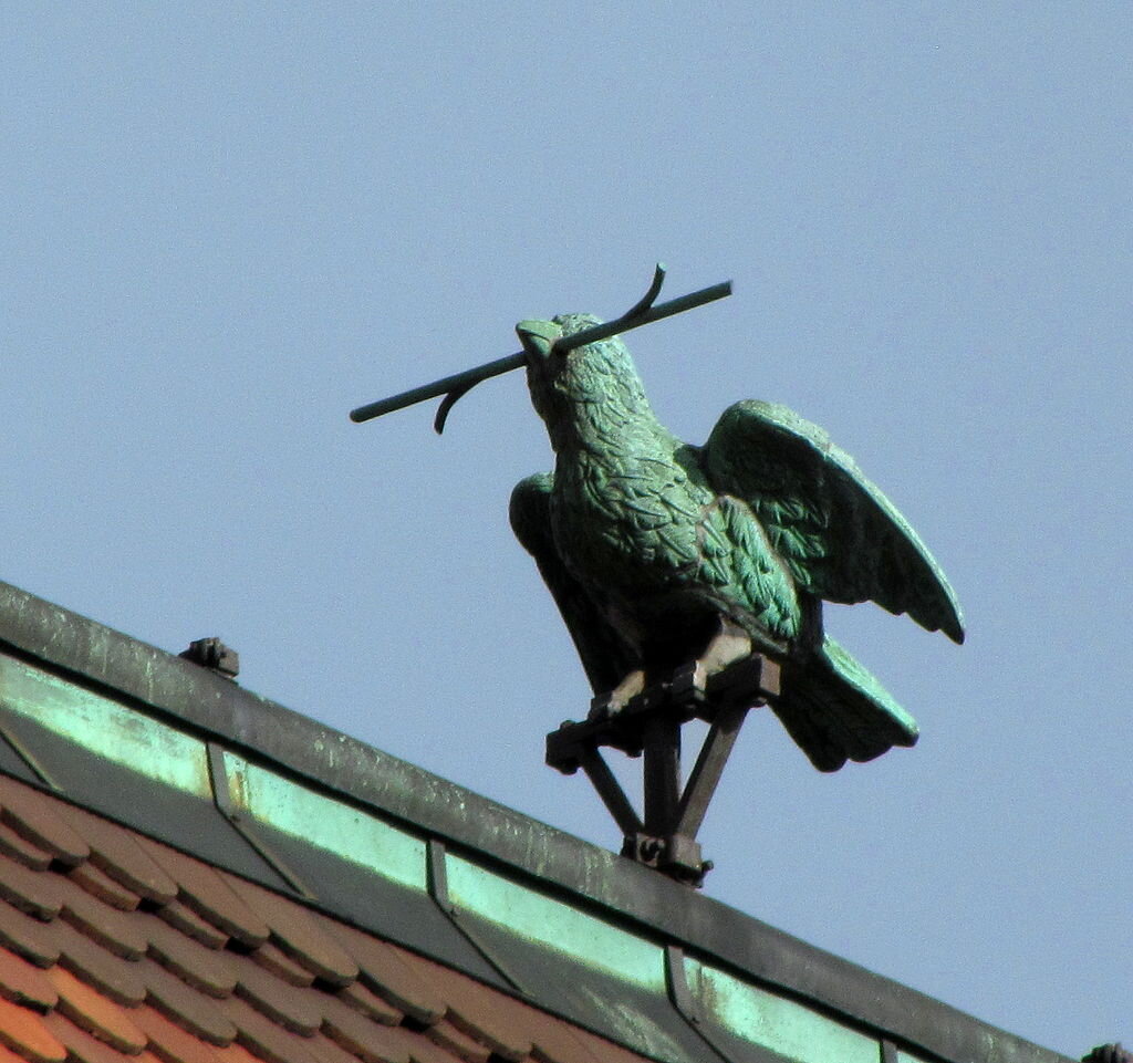 На крыше Ульмского собора (который на самом-то деле не собор, но об этом позже) стоит необычный памятник - воробью. По легенде, когда строился собор, строители не могли пронести бревна для лесов через городские ворота - слишком узкими они были. Уже было начали разбирать ворота и стену, но заметили, как маленький воробей несет в клюве соломинки для гнезда боком, а не поперек. Строители последовали примеру воробья, пронесли бревна в ворота, и решили в благодарность за подсказку поставить воробью памятник. Неудивительно еще, что сыгравший такую важную роль в строительстве собора воробей стал символом города Ульма! На самом же деле, история о том, как воробей помог строителям, была впервые записана в поэме Карла Герцога в 1842 году. А через несколько лет вместо средневековой фигурки воробья был установлен новый памятник, дар богатых горожан. И это был вовсе не воробей, а голубь, и в клюве он несет не соломинку, а оливковую ветвь. Снизу, правда, больше похоже на маленького воробушка, а что
