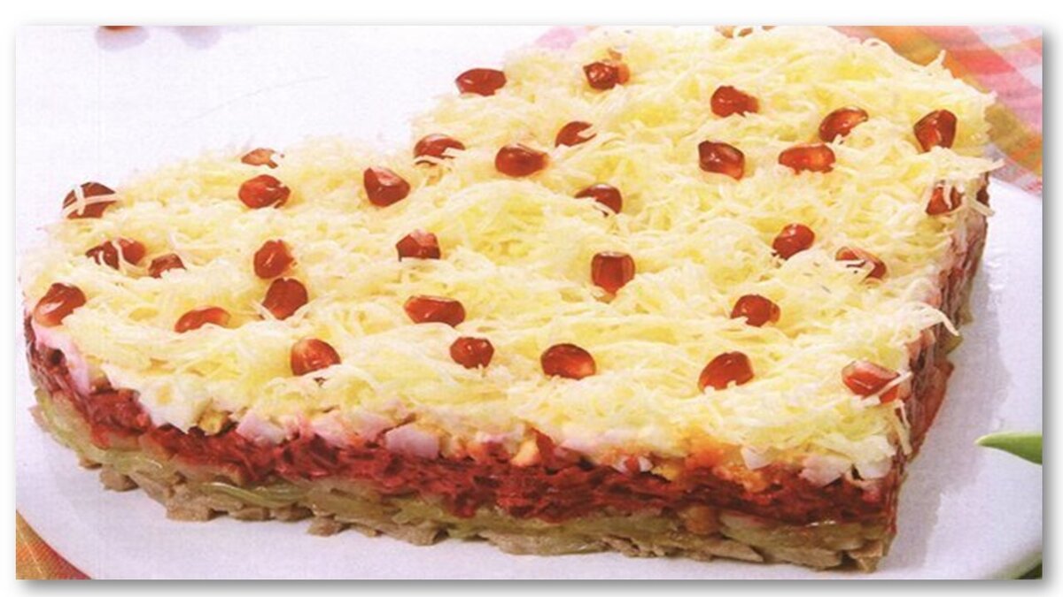 Ингредиенты: ❦ куриных яиц-три штуки ❦ майонеза-300 г ❦ петрушка ❦ чеснок-1 зубок ❦ черный перец(молотый) ❦ соль ❦ свинина-150г ❦ куриная грудка(копченая)-150г ❦ масло растительное-2 стол.л. ❦ лука-одна штука ❦ сыра (твердого )-200 г ❦ свеклы-одна штука ❦ гранат (несколько зерен) Приготовление салата: 1)Отварить яйца и мелко нарезать. 2)Отварить свинину и тоже нарезать. 3)Нарезаем куриную грудку. 4)Отварить свеклу и натереть на терке 5)Чистим чеснок и нужно пропустить его через пресс. 6)Лук очищаем,нарезаем и обжариваем до золотистого цвета. 7)Зелень помыть и нарезать мелко. 8)Смешиваем все ингредиенты: мелко нарезанные яйца,свинину,куриную грудку,свеклу,чеснок,лук , зелень,майонез,посолить и поперчить.Все перемешать. 9)Натираем на терке твердый сыр(для украшения салата). 10)На красивую тарелку выкладываем все ингредиенты в форме сердечка. 11)Украшаем салат .Сначала посыпаем натертым сыром, а затем зернами граната (можно по желанию). Салатик "Признание" готов! Приятного вам а
