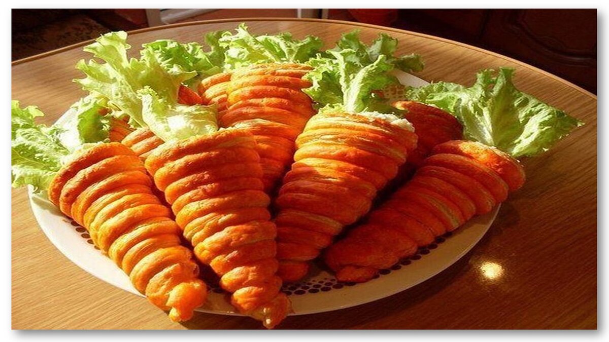 Такой салатик очень вкусный и сытный и им можно украсить праздничный стол! Ингредиенты: ❦зелень(укроп и петрушка)-один пучок ❦майонез -для заправки салата ❦замороженное слоеное тесто-500 грамм ❦грудка куриная-500 грамм ❦желток куриного яйца-одна штука ❦перец и соль-по вкусу ❦карри или куркума-одна чайная ложка ❦куриное яйцо-два штуки ❦куриные грудки-две штуки ❦огурец (свежий)-два штуки Приготовление: 1)Немного размороженное слоеное тесто раскатываем в пласт и нарезаем его полосочками по ширине в один сантиметр. 2)Далее ,чтобы сделать "морковки" ,которые будем начинять,делаем заготовку из плотного картона,свернув из них несколько кульков конусом или можно использовать конусную насадку от кулинарного шприца. 3)После этого на конусы накручиваем полосочки теста внахлест (друг на дружку),как скручиваем круассаны. 4)Противень выстилаем бумагой (пергаментной) и выкладываем на него "морковки". 5)Делаем краситель для "морковок",чтобы они окрасились в оранжевый цвет.Для этого куриный ж