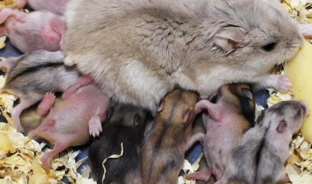Для начала нужно усвоить важное правило – не оставляйте в клетке малышей из старшего помета наедине с мамой. Если более взрослые решат, что им тесно, начнутся каннибализм и убийства. Если ваши хомяки сирийские, переселите еще и папу на всякий случай. Чаще всего у хомячихи рождается от 4 до 6 малышей, но бывают и случаи, когда их количество возрастает до 9. В таких ситуациях нужно как следует запастись клетками. Когда хомячата только появляются на свет, они краснокожие, но уже через несколько суток можно определить, каким будет их окрас. Едва заметный мех начинает расти через 5 дней. Как следует разглядеть его можно к 10 дню. Тогда же малютки открывают глазки. Как и в случае с крысятами, новорожденных хомяков нельзя трогать руками, иначе мама-хомячиха навсегда откажется от них. Потерпите две недели — тогда можно будет брать зверьков на руки, но только постепенно и осторожно. Нельзя сразу тискать грызунов, сперва они должны привыкнуть. Также с двух недель вы можете узнать пол питомц