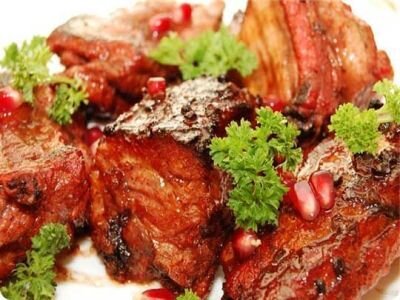 - Зелень - 100 г Готовим мясо в духовке • Говядину нарежьте небольшими порционными кусочками и залейте гранатовым соусом на 2 часа промариноваться.