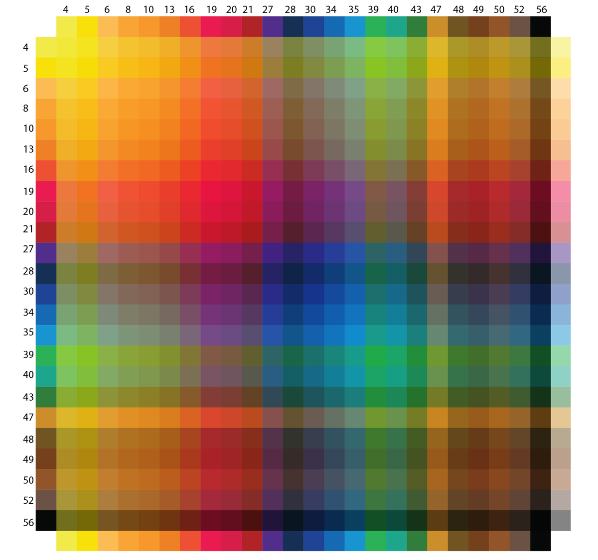 В этой статье опишу процесс создания палитры в программе illustrator. Надеюсь кому-нибудь пригодится. У меня акварель Белые Ночи. Поэтому цвета я взял из палитры на официальном сайте. Но цвета конечно можно любые взять. Да и не все цвета из этой палитры совпадают с настоящими красками. К примеру цвет Ультрамарин, в реальности кажется чуть более фиолетовым, чем на картинке с образцом. Но в глобальном плане это мелочи. Приступим. Работа будет сделана в программе illustrator. 1. Создать горизонтальный набор нужных цветов. Номер. Квадрат с цветом. Полоска с цветом. У полоски с цветом в дальнейшем будем менять прозрачность. 2. Копируем эти цвета и ставим их вертикально. У длинных полосок меняем прозрачность на 50%. 3. Накладываем поверх всего квадрат. Для того, чтобы изменить яркость получившихся смешанных цветов. Свойства фигуры будут такими: Цвет - Градация серого 25%; Прозрачность - 25%; Режим наложения - Затемнение основы. Цвета после такого наложения становятся ярче и больше соотв
