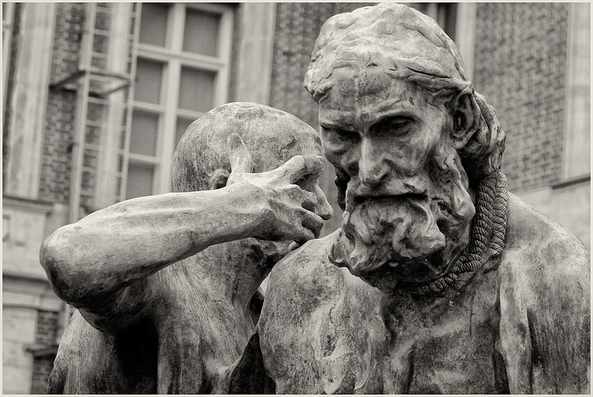 Приехал к дочке в Лондон. А там Роден. Не то, чтобы стоит такой и встречает меня в аэропорту, но все равно как-то, знаете, совпало. Я приехал, и Мыслитель приехал. Сидит в Британском музее, тужится. В смысле, думает. А еще у Родена есть знаменитая композиция под названием «Граждане Кале». Про то, как городское руководство Кале пожертвовало собой ради спасения прочих горожан. И я, прям вот, задумался. Как тот Мыслитель. Итак, известная историческая легенда. Столетняя война. Англичане окружили французский город Кале и год уже держат жителей в осаде. Еда на исходе. Воду выпили. Всё плохо. Город должен пасть. И тут глумливые английские оккупанты предлагают французам сделку. Мол, если шесть лучших людей города добровольно сдадутся, выйдут за стены с ключами от городских ворот и веревками на шеях, то их казнят, а всех остальных горожан не тронут. И, что вы думаете? Отцы города вышли. Вот такая красивая история. А я подумал, вот кто из Петрозаводского начальства вышел бы в такой непростой жи