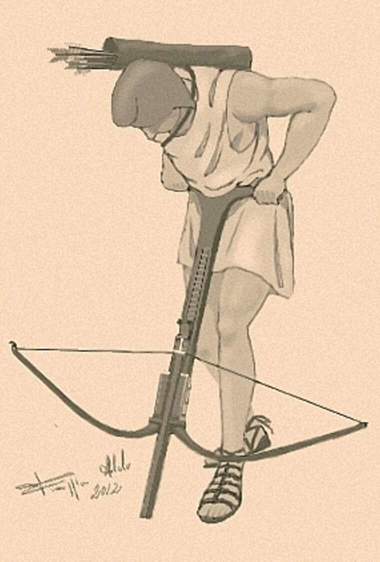 Первое достоверное упоминание о применении метательных машин относится к 399г. до н.э. Дионисий готовил Сиракузы к обороне от карфагенского вторжения. Дело было нешуточное, и в город были приглашены лучшие инженеры Сицилии, Италии и Древней Греции. Их мастерские разместились во всех свободных помещениях города, включая залы храмов, гимнасии, и даже в частных домах. Результатом их разработок стало новое оружие, созданное на основе композитного лука и получившее название гастрафет. По современной терминологии это был просто большой арбалет, который для натягивания тетивы приходилось упирать одним концом в землю, а другим в живот. Дальнейшее развитие арбалетов шло по двум направлениям: стационарная машина и ручной вариант. Рассмотрим первый вариант. Гастрафет представлял собой закрепленный на ложе мощный композитный лук, который стрелял короткими (40-60 см) болтами гранеными металлическими наконечниками. В верхней части ложа находился затвор примерно такой же длины, как и само ложе, кото