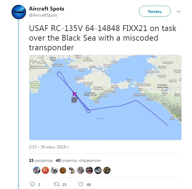 Американский самолет опять провел разведку над берегами Крыма. Об этом стало известно из аккаунта Aircraft Spots в социальной сети Twitter. Читайте: Самолеты-разведчики вновь начали летать над берегами Крыма На этот раз побережья Крыма охватил своим взором американский самолет-разведчик RC-135V с бортовым номером 64-14848, который пролетел практически по привычному маршруту для разведывательных аппаратов. Вчера, он решил начать свой маршрут разведки с побережьем Краснодарского края после чего пролетел над южным берегом Крыма. КерчьИНФО напоминает, что самолеты-разведчики летают уже не первый раз над Крымом. Еще недавно над нами летали только самолеты от Королевских Военно-воздушных сил Великобритании, но недавно к ним присоединились «коллеги» из США. Фото из социальной сети Twitter сообщества Aircraft Spots