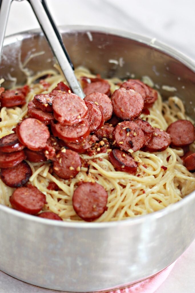 Это поистине один из любимых рецептов нашей семьи. Это также отличный рецепт для чего-то быстрого, сочного и аппетитного. Карбонара с охотничьими колбасками никогда не разочарует! Ингредиенты: 5 столовых ложек сличвочного масла 1.5 стакана крепких сливок 600-700 грамм спагетти - Заранне сверенных 500 грамм охотничьих колбасок 200 грамм бекона - нарезать кусочками 1-2 чайной ложки измельченного чеснока 100-150 грамм тертого сыра (Пармезан), но мы используем тот, что есть :) Специи по вкусу. Приготовление: На раскаленную сковороду выложите масло, подождите пока расстаит, после чего приступайте к приготовлению бекона. После того, как вы пожарили свой бекон, аккуратно удалите часть жира со сковороды и начните обжаривать нарезанную колбаску. Как только вы заметили некоторое поджаривание, переверните колбаски и потомите их 1-2 минуты. После жарки мясо в сторонку, уменьшите огонь и добавьте чеснок. После чего добавьте в сковороду макароны, сыр и тщательно всё перемешайте. Когда сыр чуть