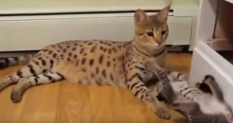 Видео, в котором мама кошка играется с котенком и воспитывает его