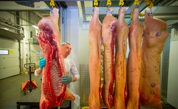 При покупке мяса хочется быть уверенным в его свежести и иметь возможность выбрать хороший кусок. Давайте посмотрим, какой путь проходит свинина до того, как переходит в руки покупателей, на примере белорусской сети магазинов ProStore. Машина с рефрижератором от постоянного поставщика останавливается у разгрузочной рампы, предназначенной для приема мяса. Туши с клеймами сразу направляют в камеру для хранения. Для разгрузки туш удобно использовать специальный манипулятор: Без клейм принимать мясо не имеют права — так указывают партию, когда был произведен убой этой свинины, и видно, что она имеет ветеринарное свидетельство. Также с помощью клейма указывают, к какой категории туша принадлежит — первой, второй или третьей - Это зависит от толщины шпика. В охлаждаемой камере мяса, куда в течение пары минут после выгрузки попадают туши, поддерживается температура от минус двух до плюс двух градусов. Свинину получают охлажденную, чтобы температура в толще была не выше четырех градусов. Пост