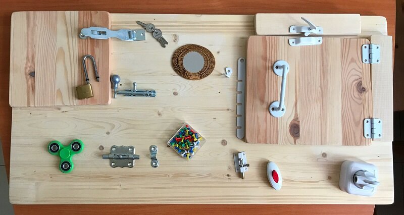 Стандартного набора деталей и элементов на бизиборде не существует. Но к ним предъявляют требования. Например, они должны быть разнообразными и яркими. Важно, чтобы они отличались по фактуре, ведь ребенок познает окружающий мир, в том числе при помощи тактильного восприятия.