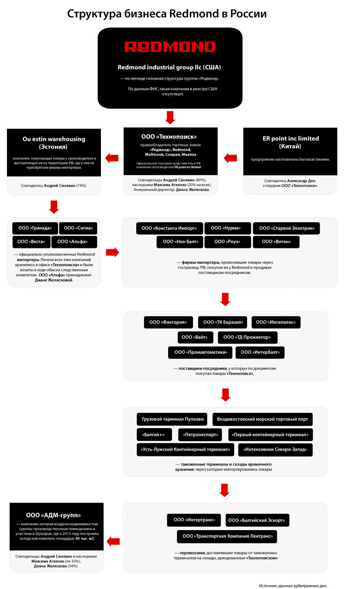 Группа «Редмонд», обороты которой в лучшие годы достигали 20 млрд рублей, была одним из лидеров российского рынка кухонной электротехники: мультиварок, соковыжималок, мясорубок и др. Изначально компания позиционировалась как «дочка» американской корпорации, но со временем выяснилось, что никакой корпорации в Штатах нет, а есть группа предприимчивых молодых петербургских бизнесменов. Пока «засветились» среди них трое: Андрей Синявин (он отвечает за IT-разработки и развитие технологий), Диана Желяскова (она «рулила» импортом и торговлей в России) и Максим Агеенко (он курировал вопросы недвижимости и развивал логистику). Кроме них в материалах судебных дел фигурирует также Александр Ден, который, похоже, отвечал за производство в Китае.