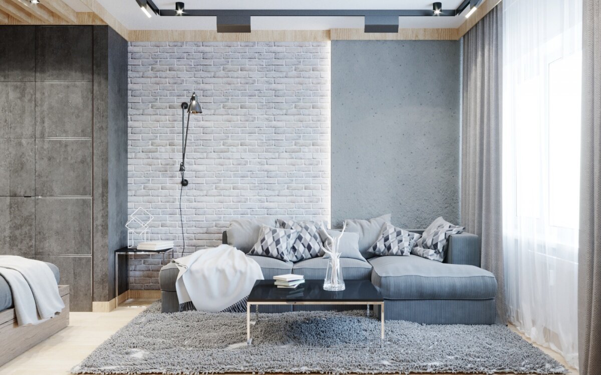 Вопреки известным стереотипам, дизайнеры не рекомендуют заковывать маленькое пространство в исключительно бежевую гамму. Необычные и комфортные интерьеры могут появиться даже в случае экспериментов с серыми оттенками. Руководитель студии архитектуры и дизайна A.A.G Алексей Афанасьев предлагает рискнуть и попробовать сочетание серых тонов — от бетона до серебристо-серого — с белым цветом и древесными фактурами. Залог успеха — светлый пол и белый потолок с продуманным искусственным освещением.